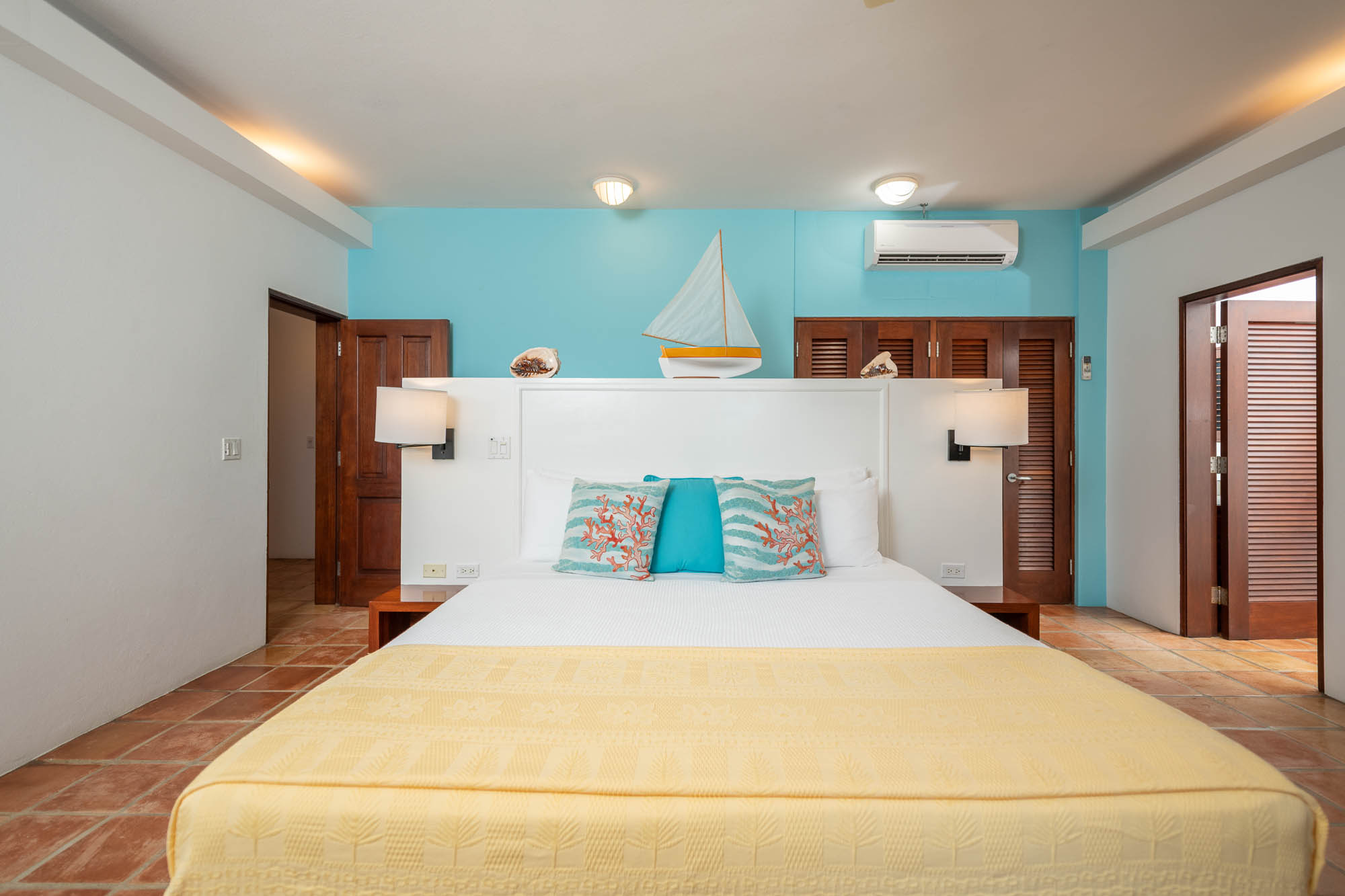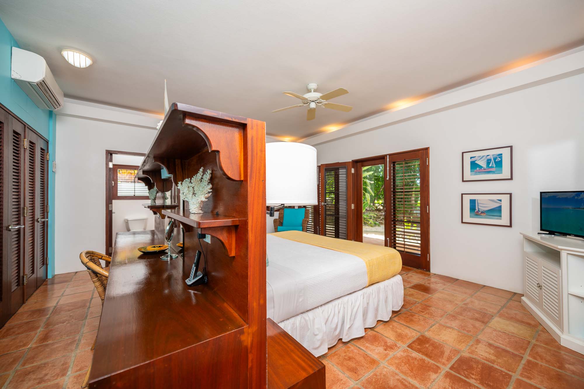 2 air conditioned garden view bedrooms (one king/one with twins that can be made up as a king) both with en suite bathrooms, private terraces and ceiling fans. Half bathroom on main floor. Max occupancy: 4