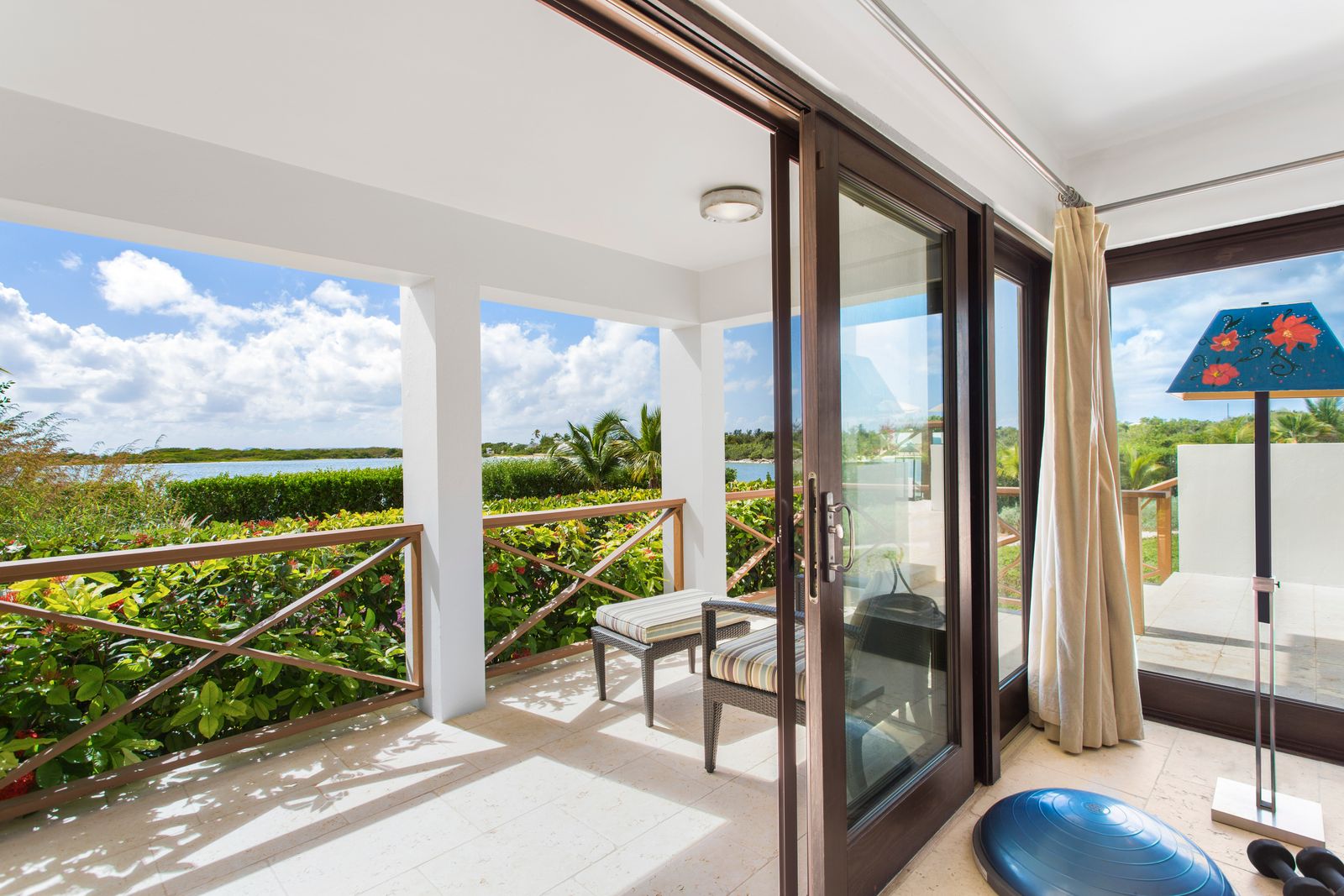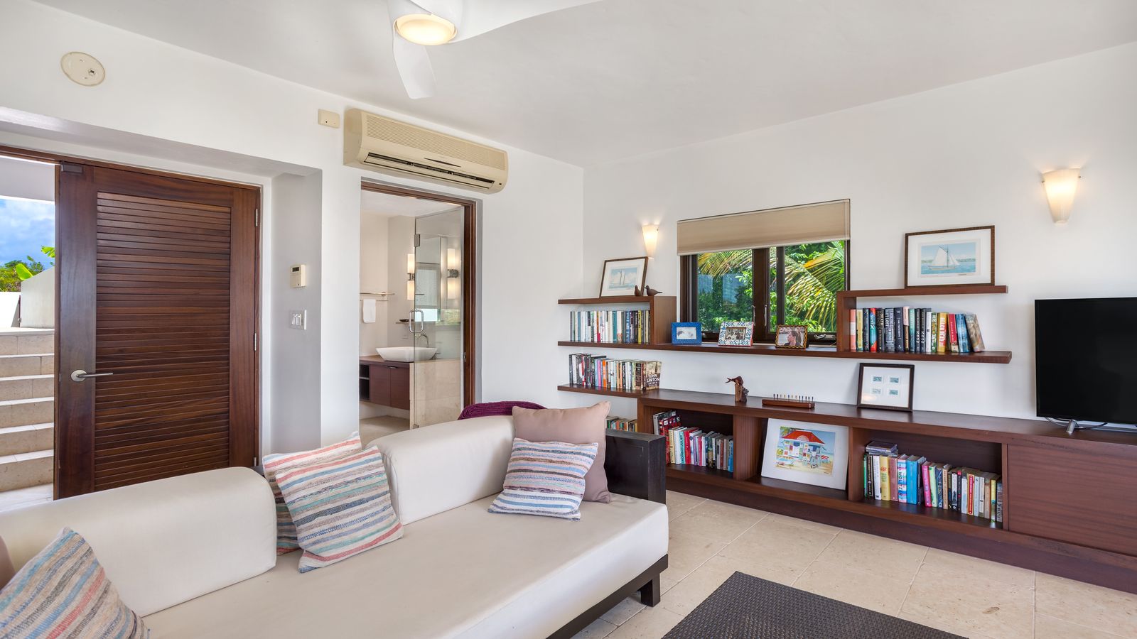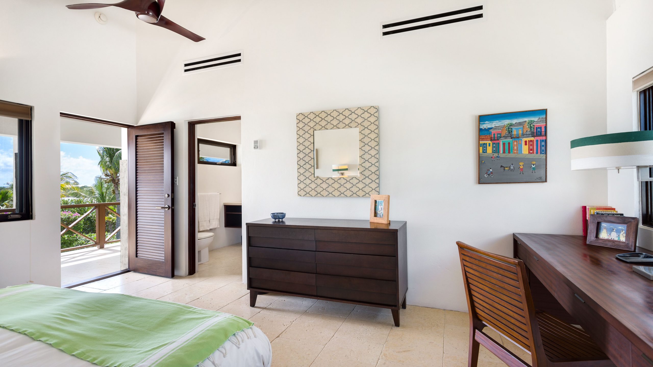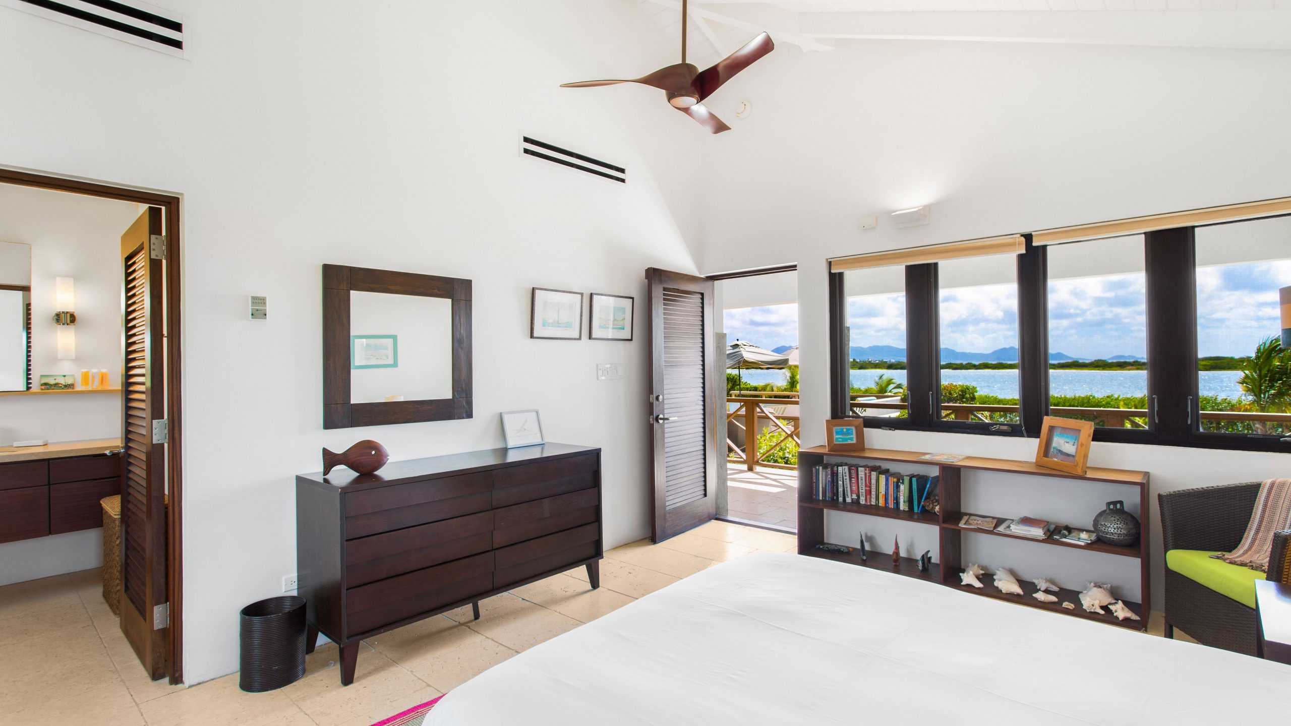 The West Wing (upper level) of the villa hosts two guest bedrooms, one with a Queen Bed and the other with two Twin Beds that can be made into a King bed. Each room has an ensuite shower, air-conditioning, ceiling fans and opens up onto a patio with fantastic views of the sea.