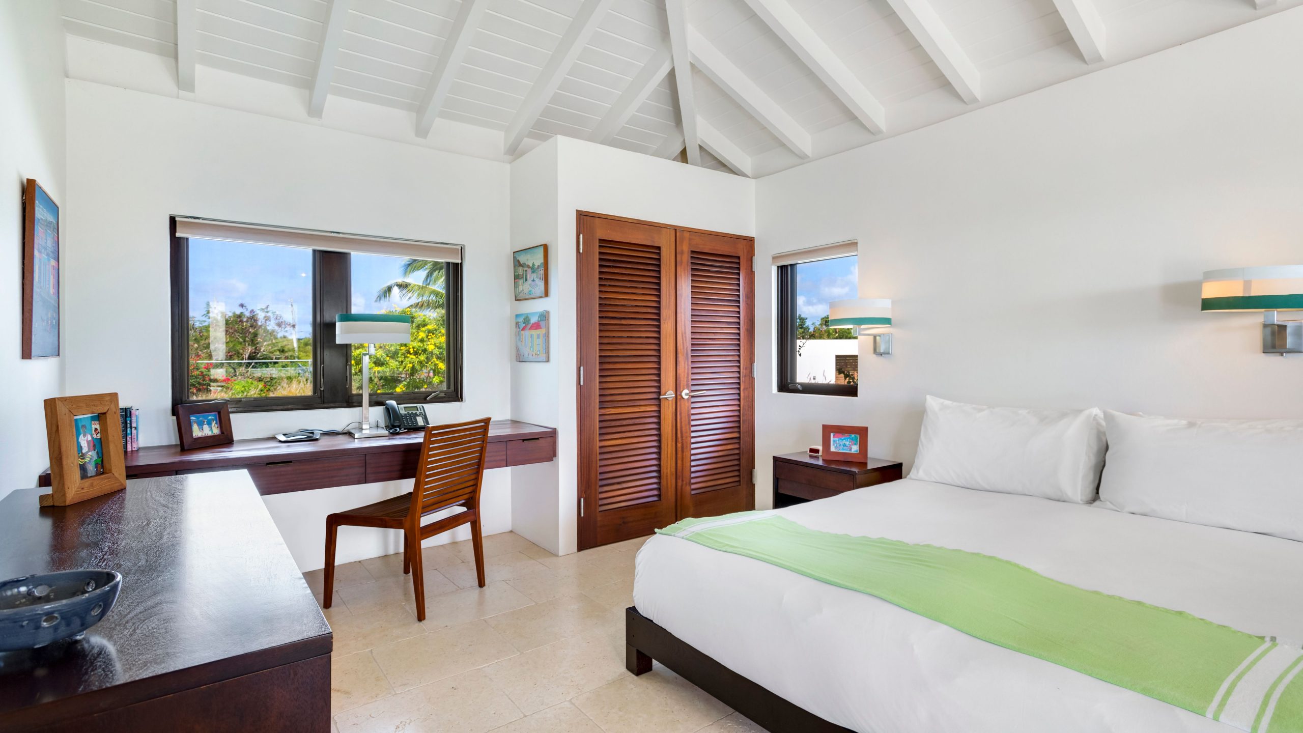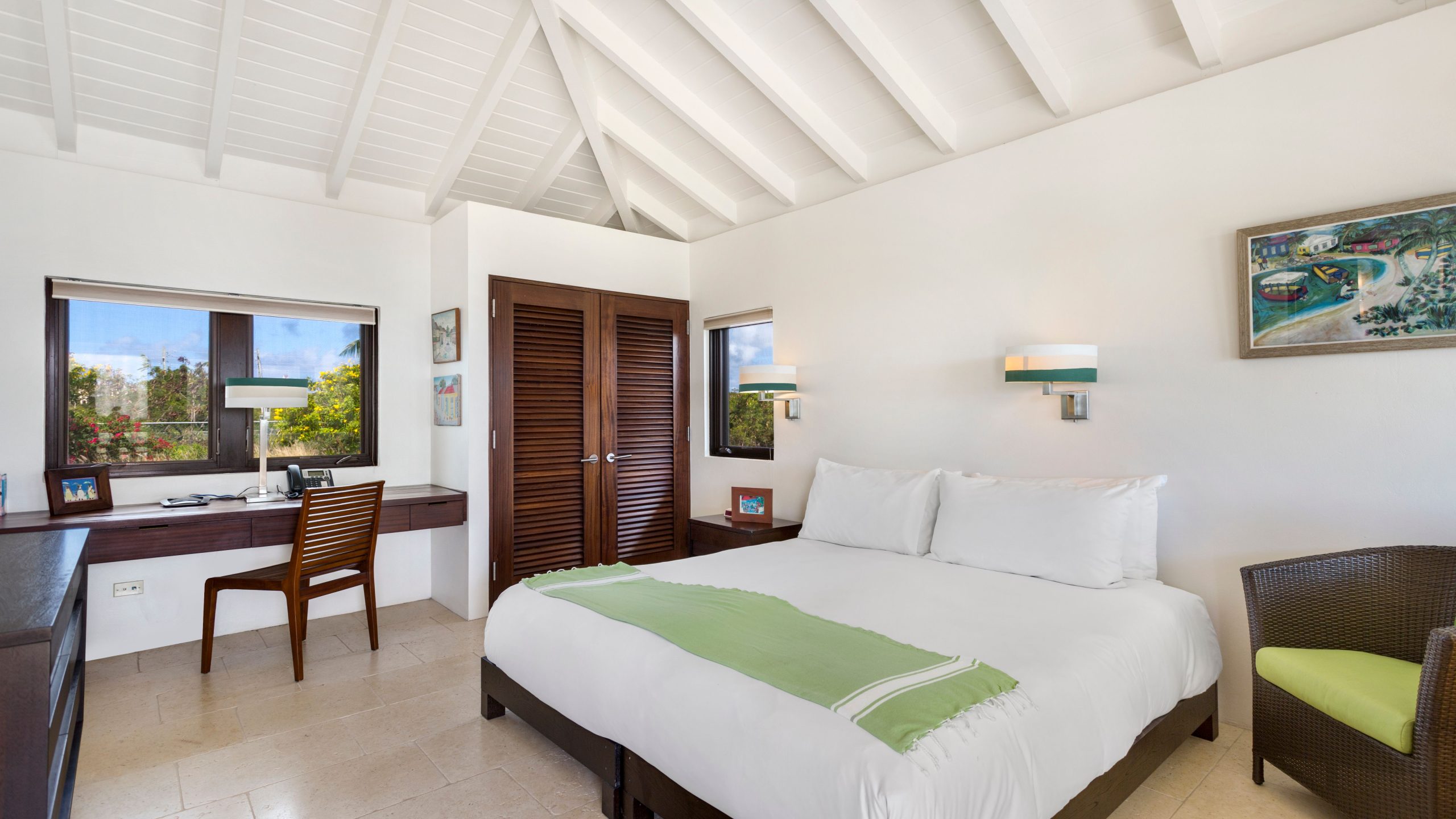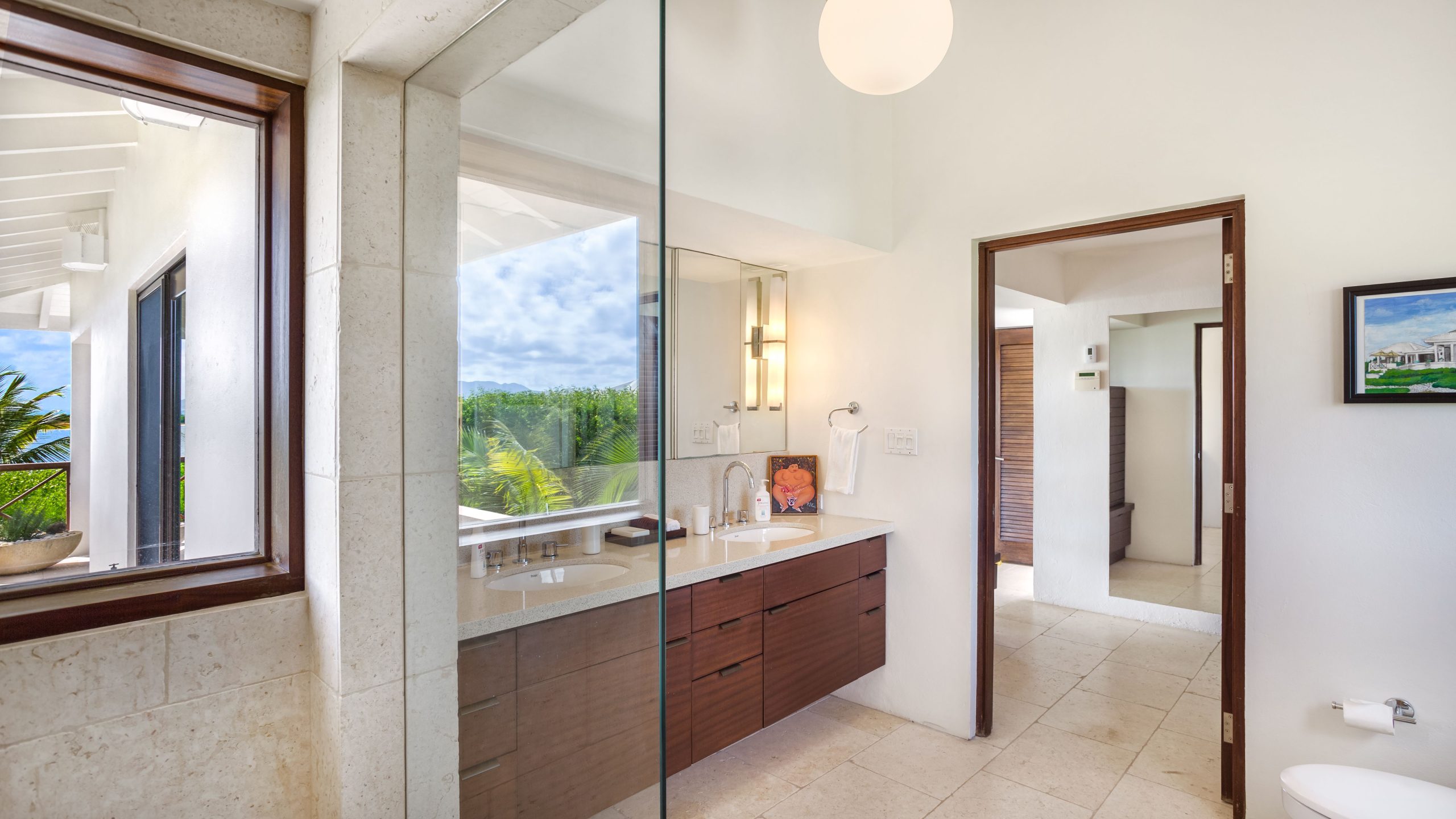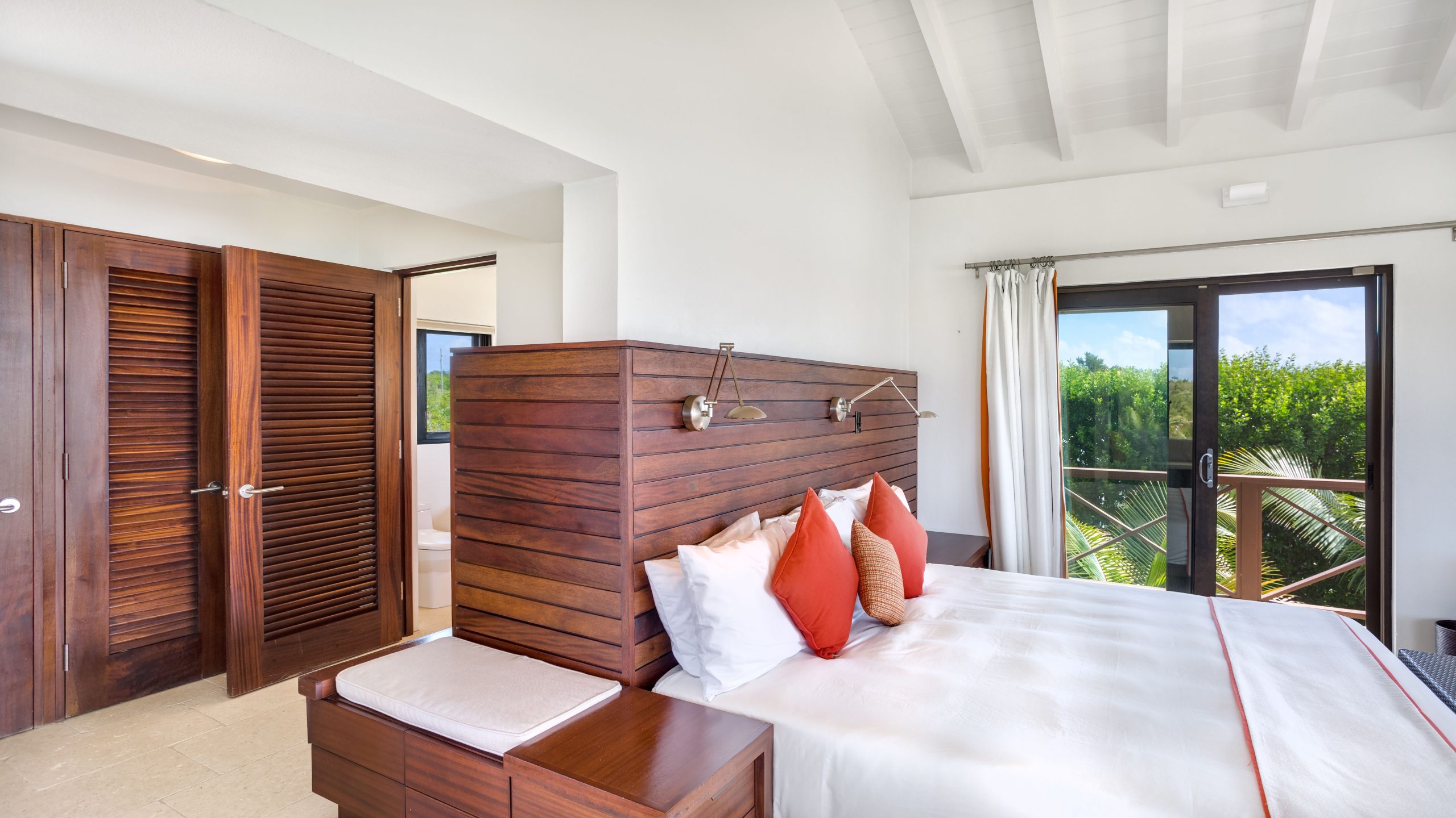 The West Wing (upper level) of the villa hosts two guest bedrooms, one with a Queen Bed and the other with two Twin Beds that can be made into a King bed. Each room has an ensuite shower, air-conditioning, ceiling fans and opens up onto a patio with fantastic views of the sea.