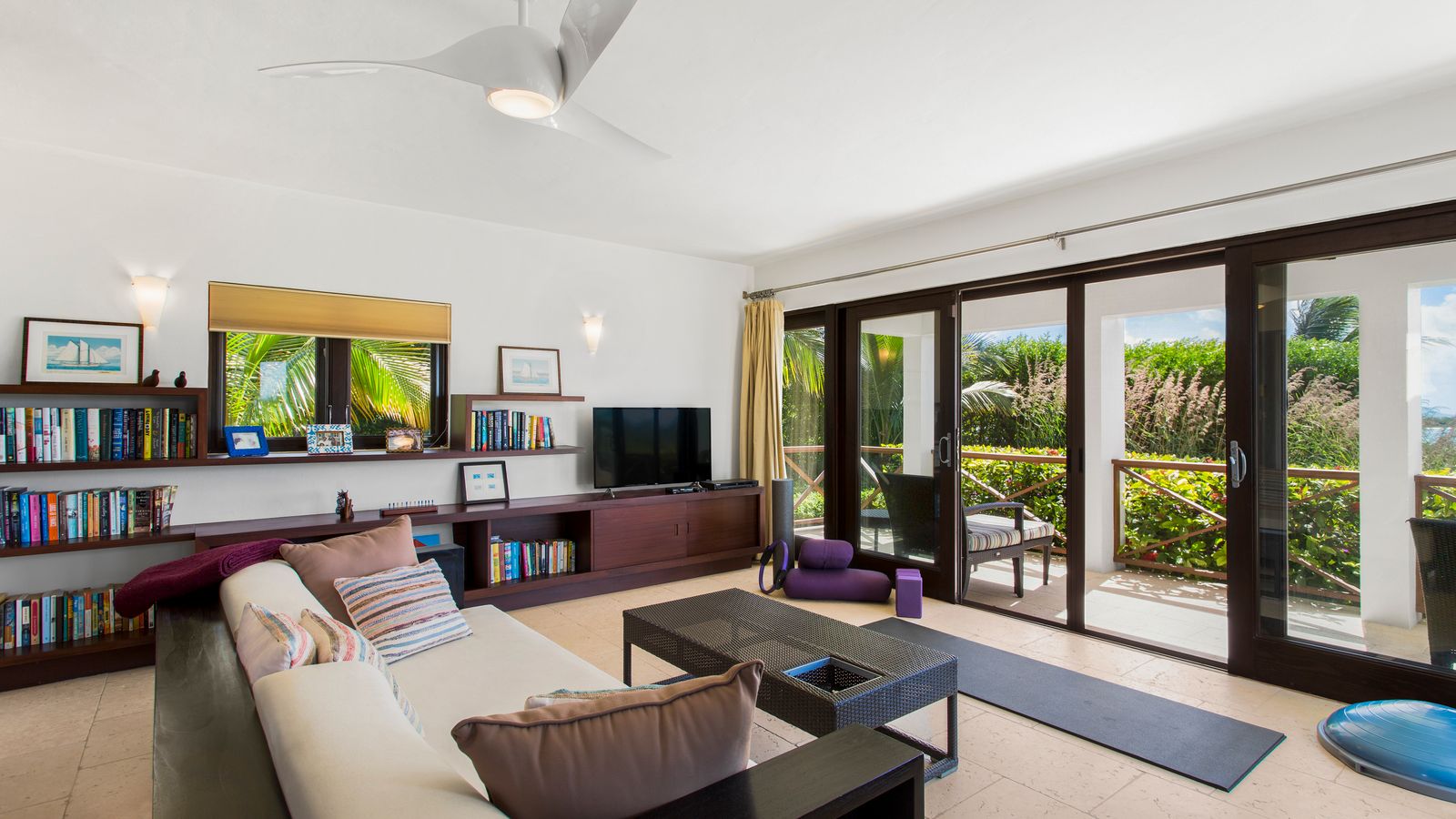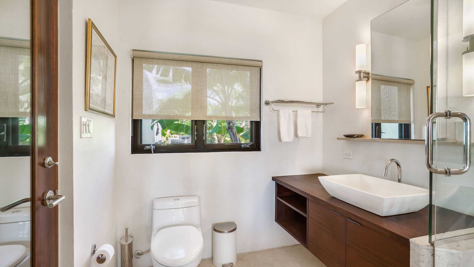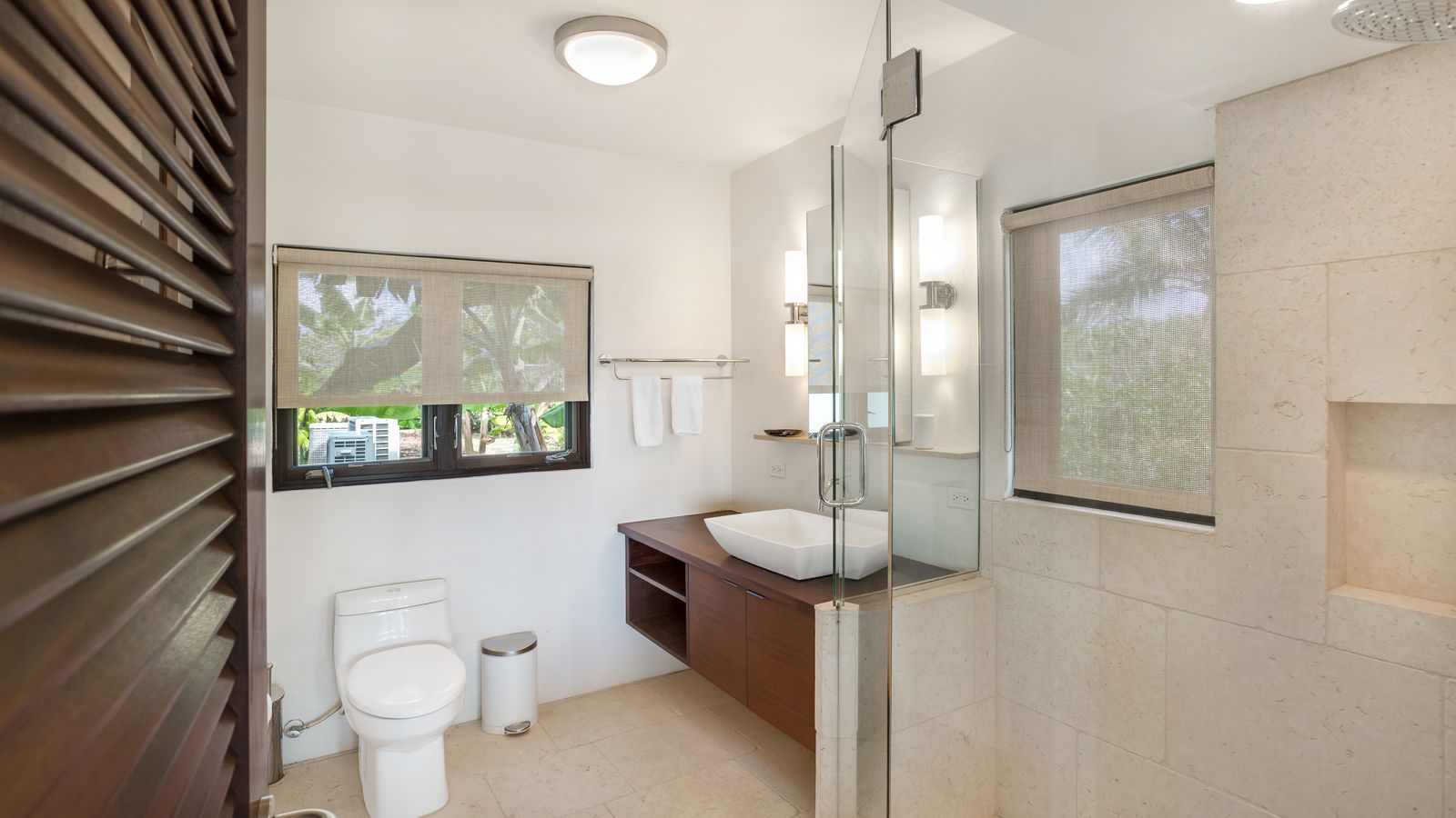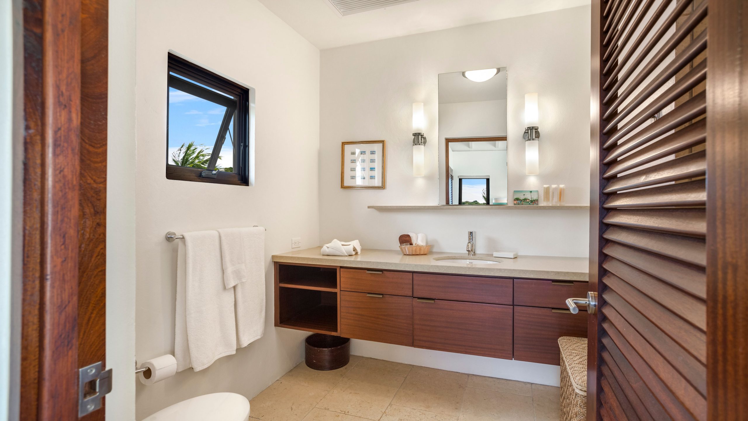 The West Wing (upper level) of the villa hosts two guest bedrooms, one with a Queen Bed and the other with two Twin Beds that can be made into a King bed. Each room has an ensuite shower, air-conditioning, ceiling fans and opens up onto a patio with fantastic views of the sea.