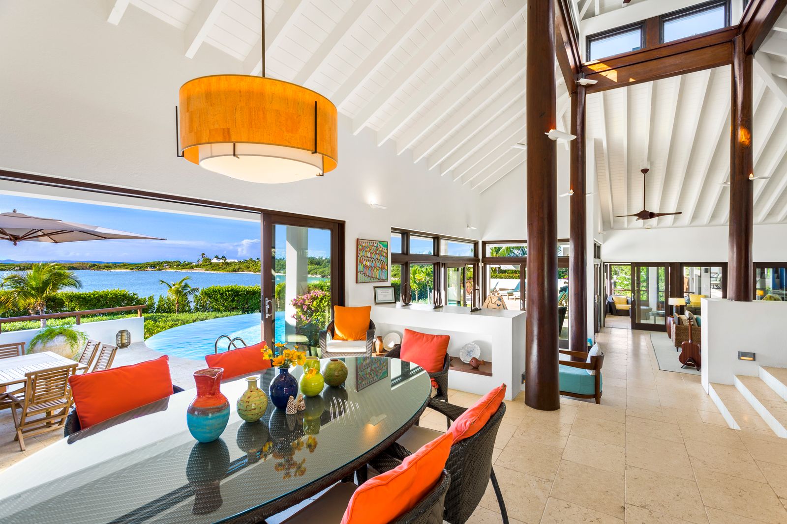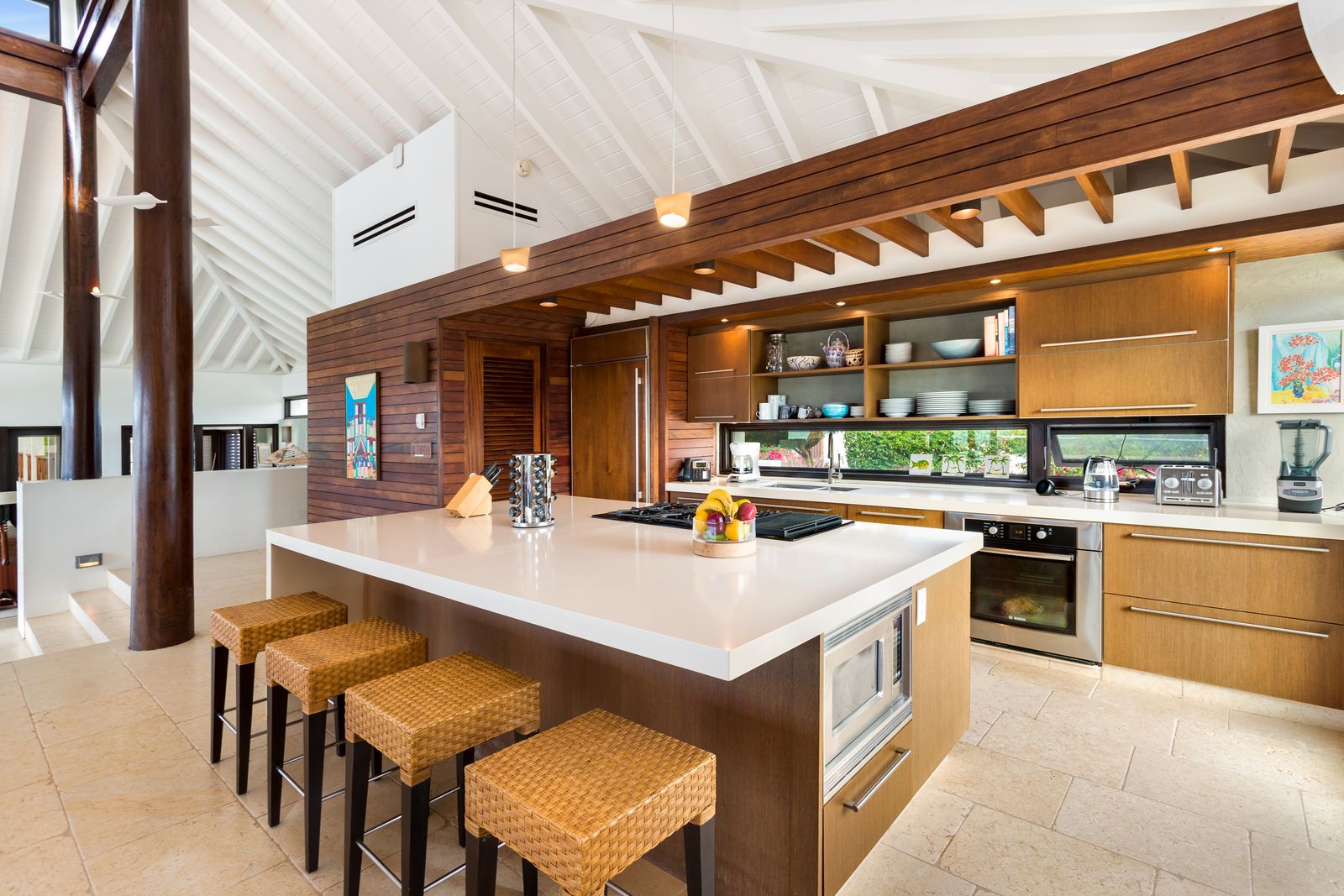 Kitchen: The modern kitchen and living areas immediately welcome you with their gracious scale and Caribbean charm. The kitchen is open and complete, with a half bath and a lovely dining area, which opens up through expansive sliding glass doors onto the pool deck, where you can enjoy convenient dining as well.