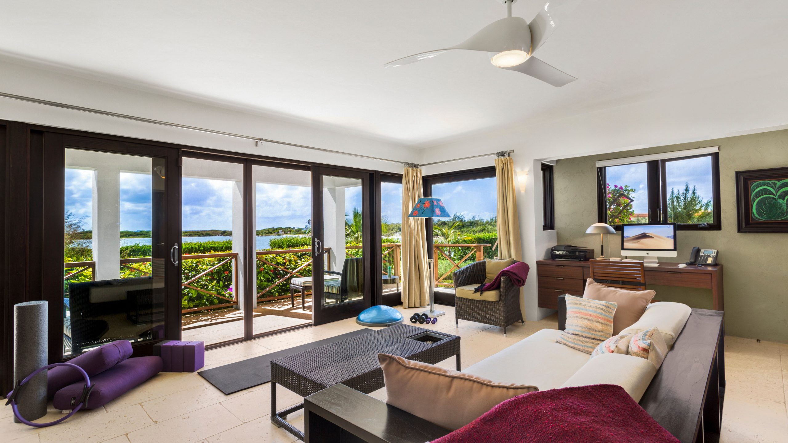 The Master on the East Wing offers gracious living and enjoys its own private balcony, ensuite shower with natural stone tiles and captures magnificent views of the bay. The suite also provides air-conditioning, ceiling fan as well as a large flat screen TV. Also on the East Wing there is a separate Study with ensuite shower.