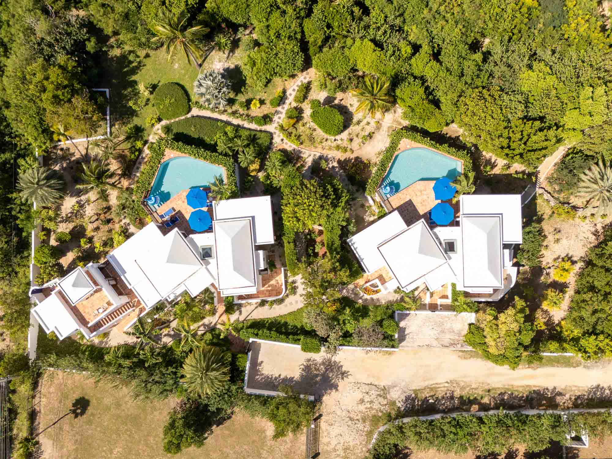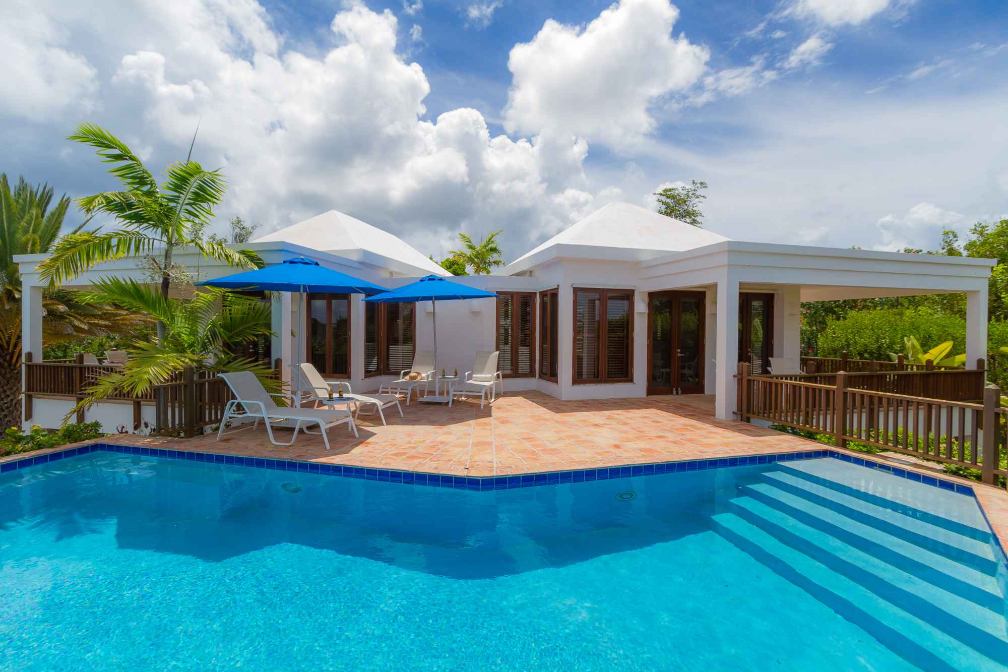 Twin Palms Villas are undoubtedly one of Anguilla’s most conveniently situated vacation homes. For larger parties 2-bedroom Beach Palm Villa can be combined with 3-bedroom Coconut Palm Villa to create a spacious 5 bedroom villa estate steps away from one of the world’s best beaches – Meads Bay. When combined, you get two villas— that means two pools, two kitchens, two terraces, and double the space to relax in paradise with the people you love. These exceptional villas are also within easy walking distance of many of the West End’s gourmet restaurants, 5 star hotels and spas. The villas are situated in a large, walled garden where clever landscaping and walkways separate and provide privacy for the two properties. Take a leisurely two minute walk to Meads Bay Beach where lounge chairs and umbrellas are set up for the exclusive use of our guests.